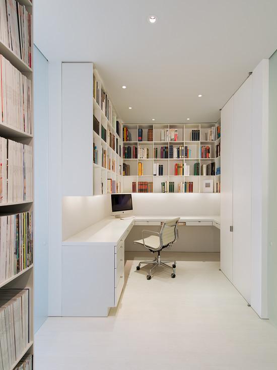小編的話:純白色的家具沒有任何裝飾給人以純粹的美感。而這款書房在設計上主要以收納功能為主,將大量的書籍分門別類的存放,保持了書房的簡潔性。
