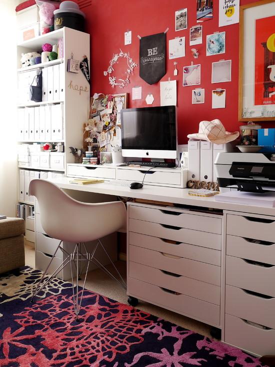 小編的話:紅色的背景墻高調而熱情,與白色家具互補。一些毛絨的玩具和照片的裝飾無疑都透露著這間書房女主人的少女心和懷舊情結。