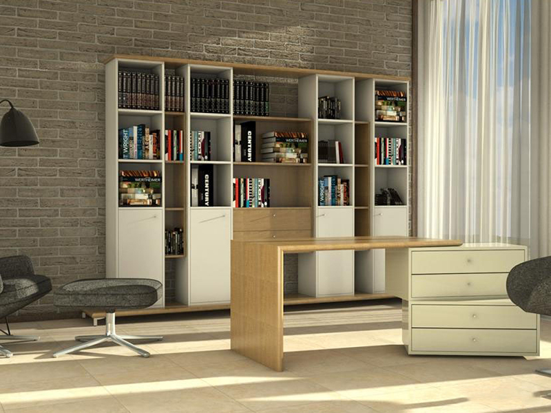 原木色自然色系,造型簡潔大方,書櫃儲物空間大而豐富,功能區域合理劃分;L型書桌更充分利用轉角空間, 簡約實用。
