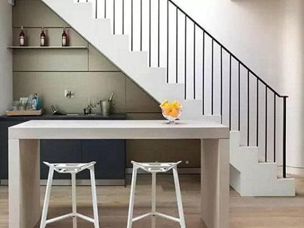 將梯子隱蔽起來,最好將其藏在墻體的后方,用兩面墻將其夾住,這樣就消除了“割斷氣場”的困擾,同時也會讓人在上下樓梯時得到極大的安全感,另外對于樓梯底部的空間,也可巧妙利用,將其設計成儲藏室或廁所。