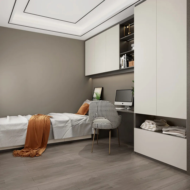 衣櫃+書櫃+書桌+床一體化設計,非常節省空間,又能保證該有的功能一應俱全。這樣的房間給兩個娃,很難不滿意吧?