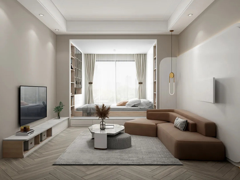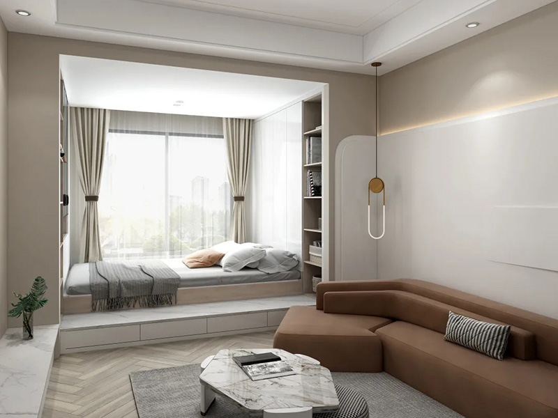 在陽臺做步入式榻榻米,兩側客製化衣櫃書櫃,讓客廳陽臺連成一體,瞬間變身多功能儲物休息室,客人留宿有去處。