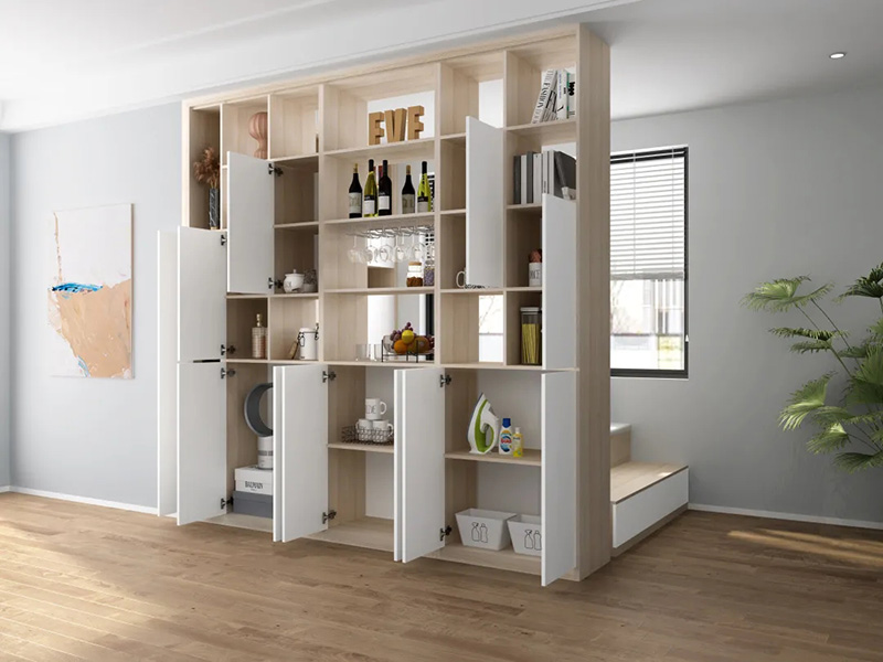 餐邊櫃作為榻榻米和餐廳間的隔斷,藏露設計很重要。建議是櫃體上方多做開放格,下方封閉櫃,避免開關櫃門時磕碰。