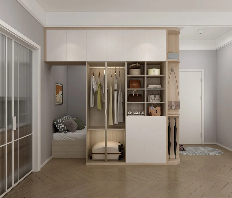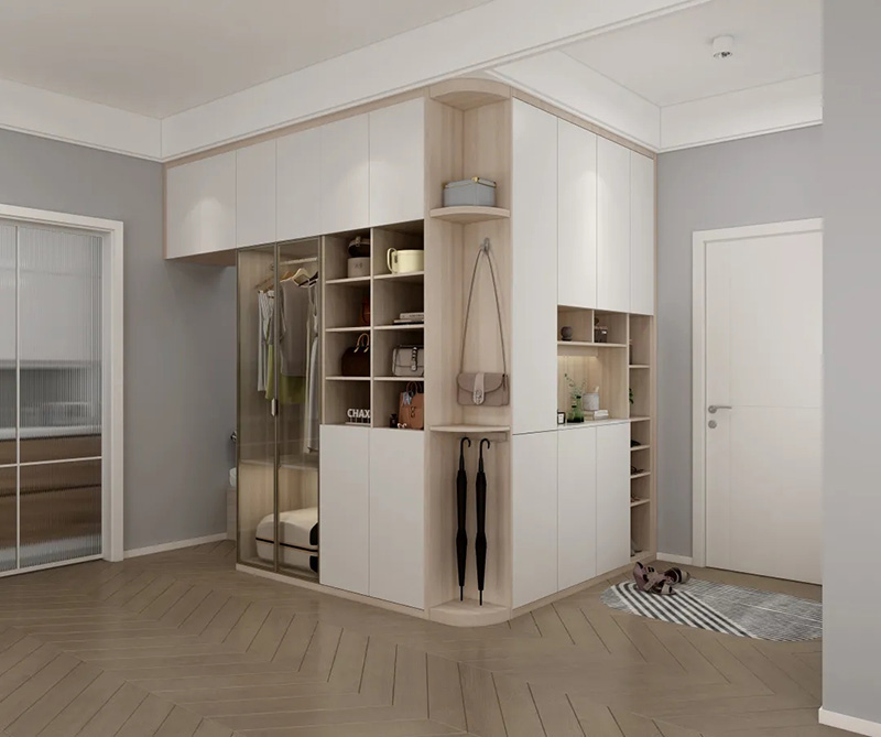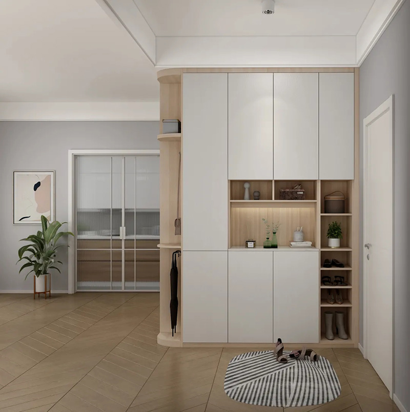 有些戶型入戶面積比較大,可以考慮挪出部分入戶空間單獨做個房。進門有凹位玄關,客製化兩面圍合型L型玄關櫃,外面作入戶櫃,放包包掛衣服解放雙手,里面則是一個“小房間”。