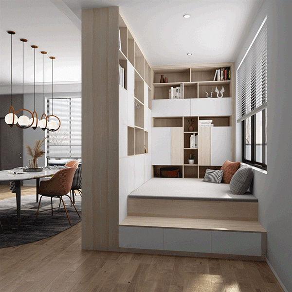 餐廳大的戶型,客製化一面頂天立地餐邊櫃,靠近窗戶那側做成休閑榻榻米。餐邊櫃兩面兩用,榻榻米用來休憩放松,即使小倆口的朋友都來,還能分開兩邊招待,互不干擾!
