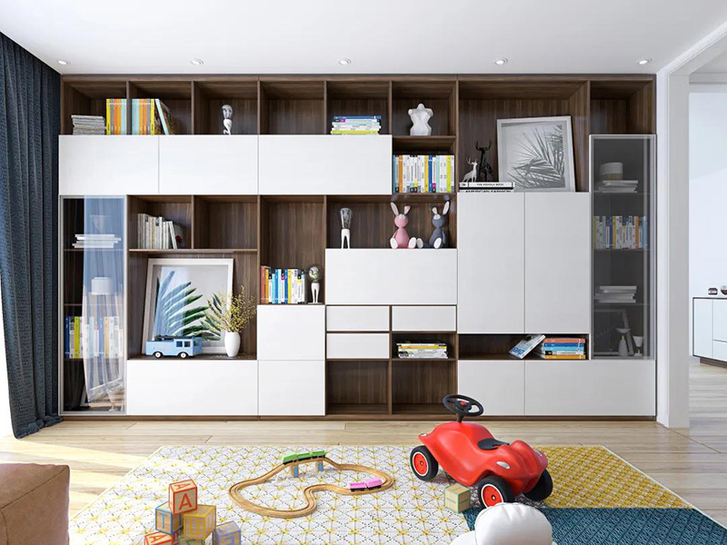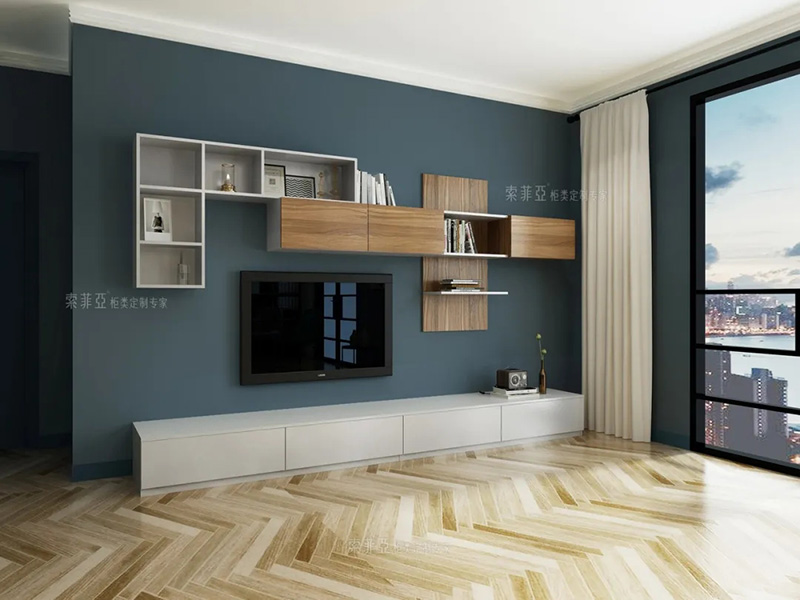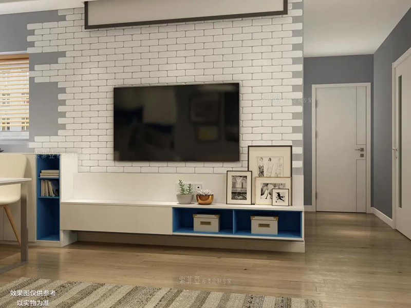 有了初階版的靈感,在原墻面+背景墻+電視櫃,這三個層次的基礎上,在電視墻上再增加一些收納櫃體,給人一種強烈的個人設計風格,而且還可以用來展示和收納,一舉多得。