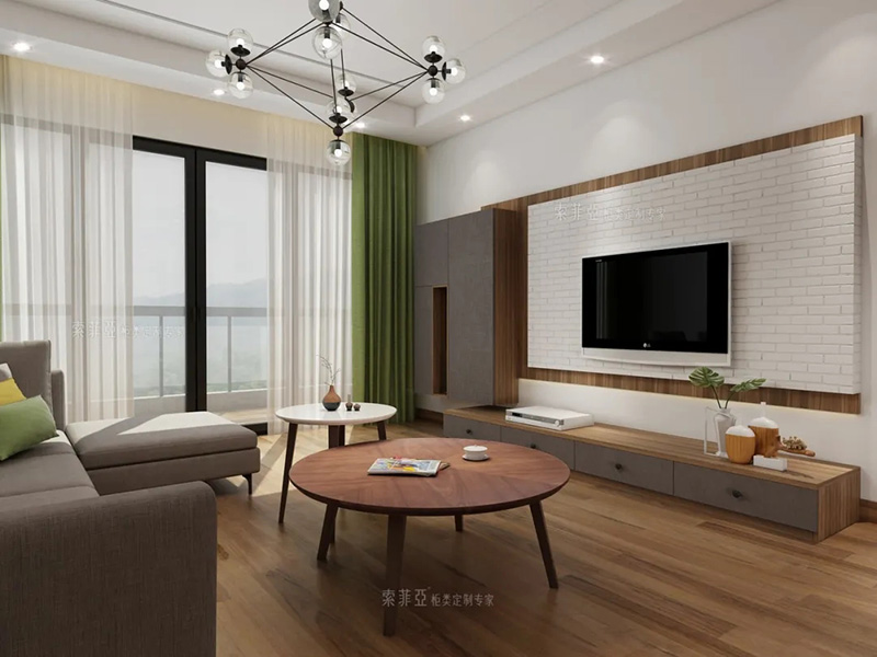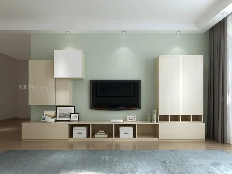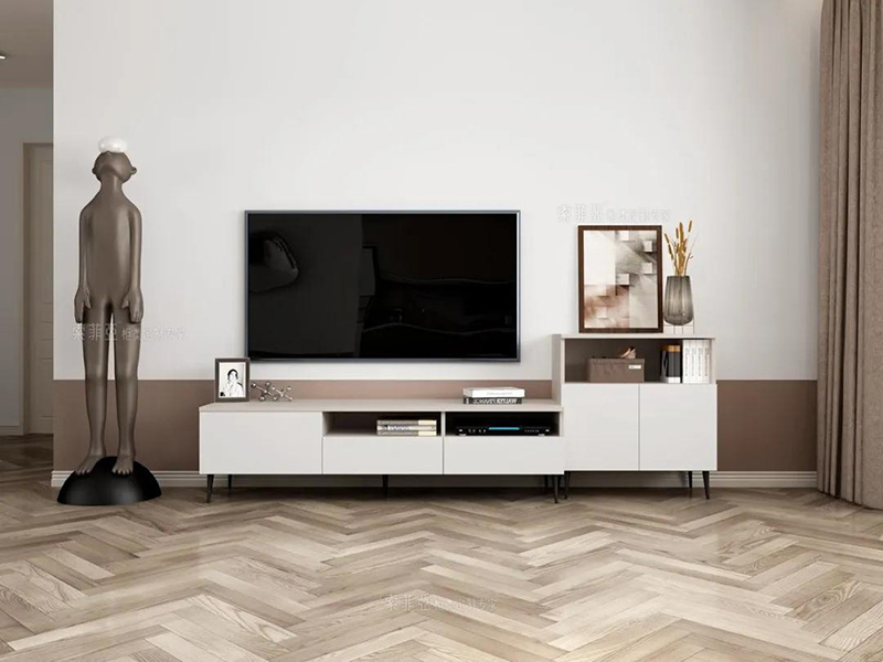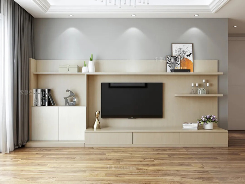 一般人都會這樣布置電視背景墻:一面墻壁面前擺一個電視櫃。