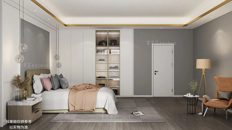 臥室利用凹墻將衣櫃做進墻,實際面積是一樣的,但是和墻面齊平的衣櫃往往能讓房間看起來更大,更開闊。