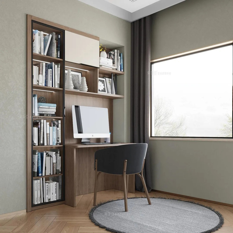 甚至還能在客廳的側邊,將書櫃做進墻,打造別致客廳工作區。