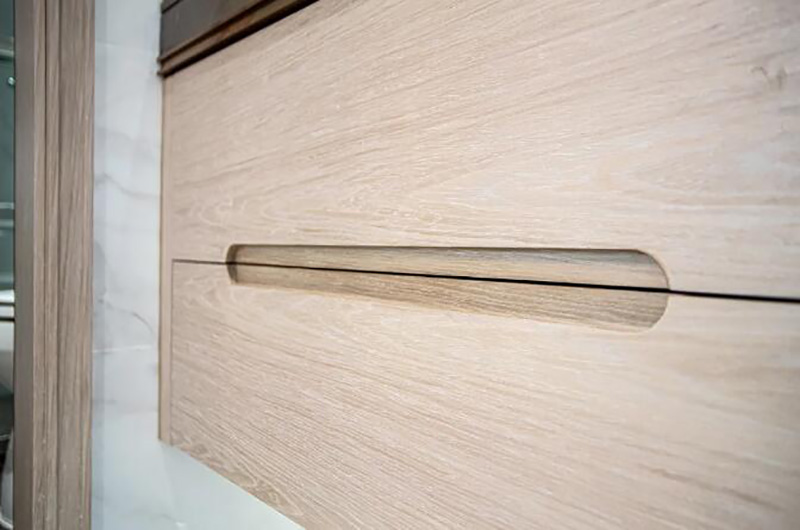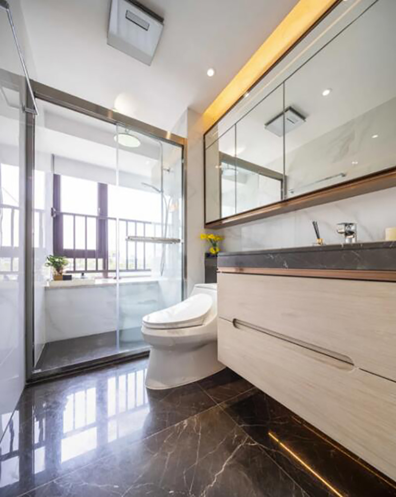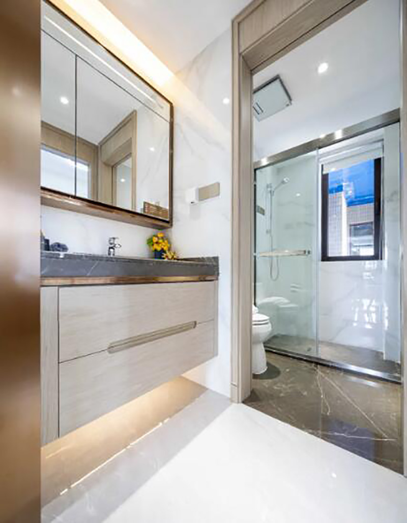 外觀的美感需花心思,內部的設計細節也同樣重要。地櫃抽屜做暗拉手,功能性上將抽屜的內置抽芯做特殊造型,既滿足了收納的同時更好的隱蔽污水管,側面添加的馬桶伴侶也提供了方便時物品的儲放。