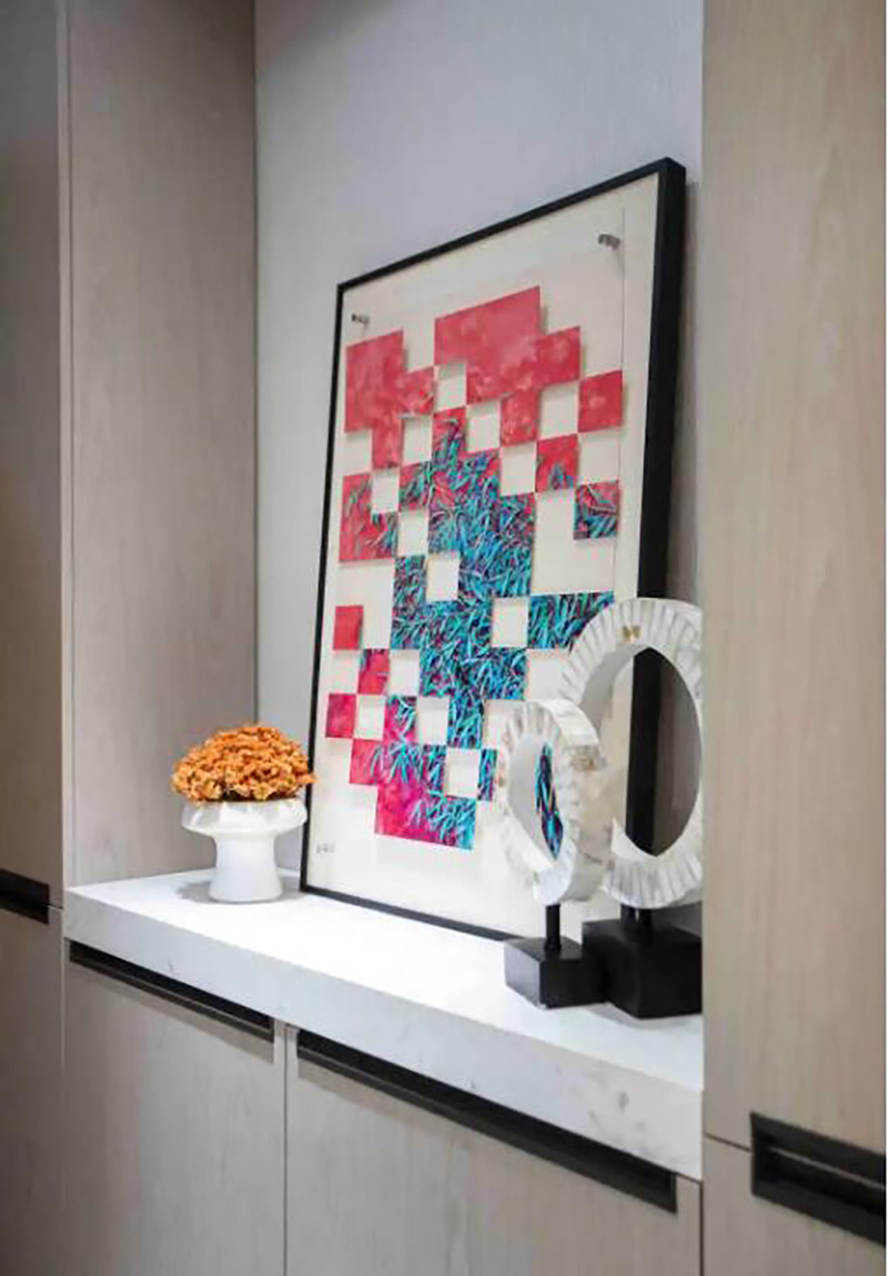 入戶空間是走進家門的“第一印象”。在本次項目中,設計師合理利用了入戶空間的一側墻體,打造“凹”字型玄關櫃。白橡山紋櫃體在腰線處搭配啞黑色不銹鋼拉手,整體顯得雅致大氣。在中間鏤空處,擺上一副心儀的裝飾畫,輕松打造一個亮眼玄關空間。