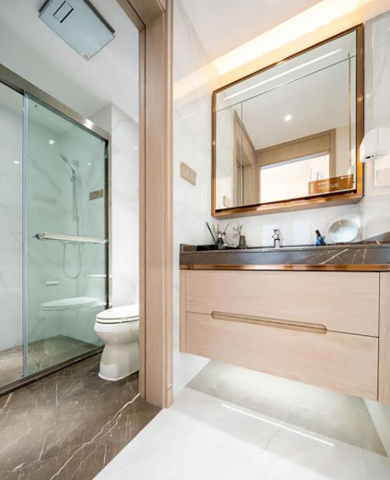 玫瑰金不銹鋼的運用讓浴室櫃顯得精致典雅。浴室櫃利用材質的特殊性,使簡單的線條更有層次感,頂部燈光的融入讓冰冷的材質也有了溫度。