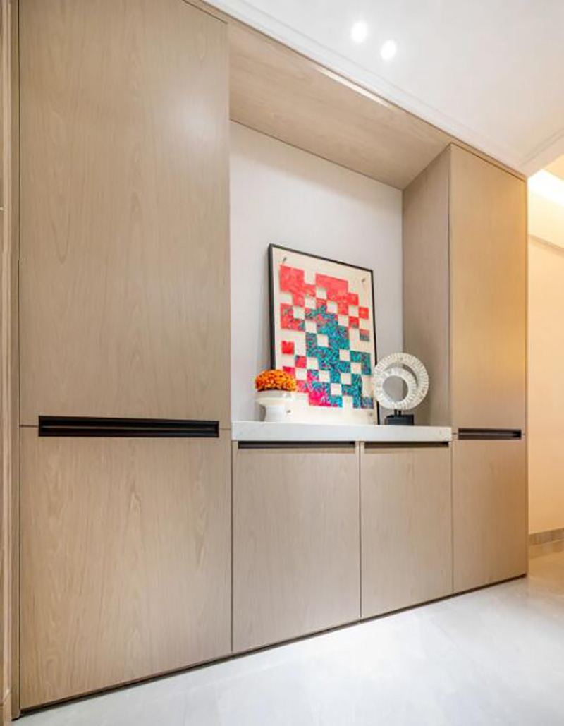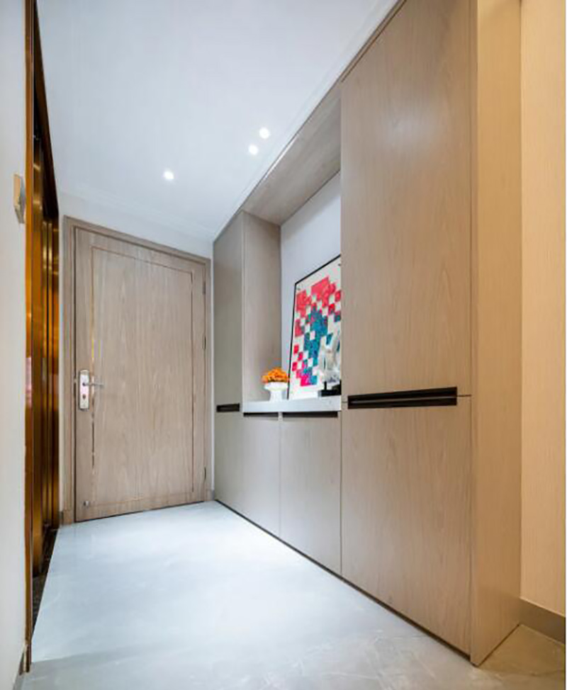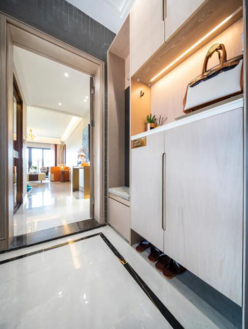 入戶空間是分離外交叉污染的重要“屏障”。經過了疫情的考驗,相信大家都明白一個科學布置的入戶空間不僅能讓全家人從容出入,更能保證一家人的健康。設計師給隨身衣物、手包和雨傘設置了專門的收納空間,鑰匙則掛在門口的掛鉤上,匆忙出門家人們再也不用擔心“丟三落四”。臨出門前,對著全身鏡整理下儀容,精神抖擻地迎接新一天的挑戰!