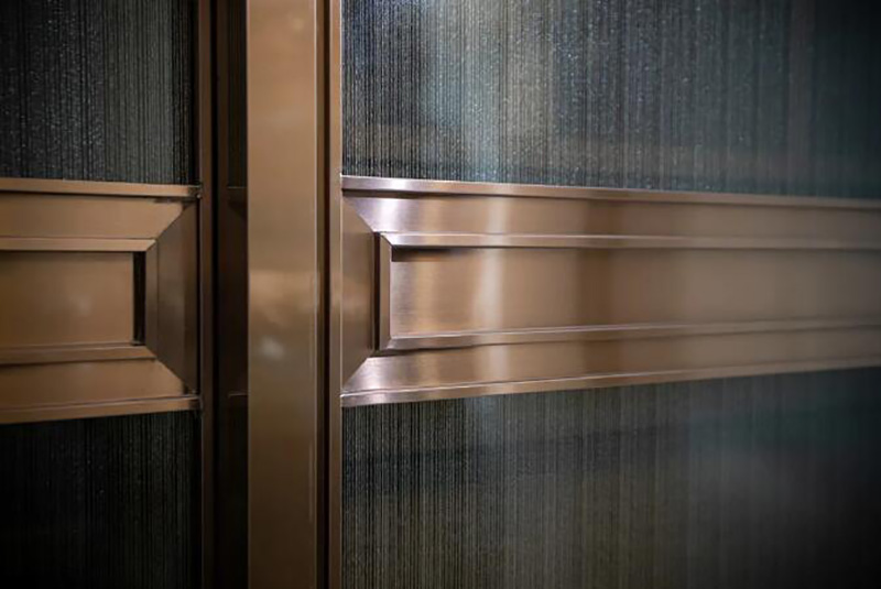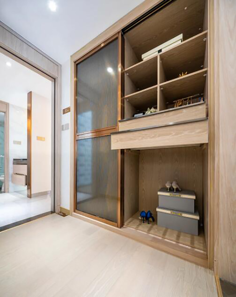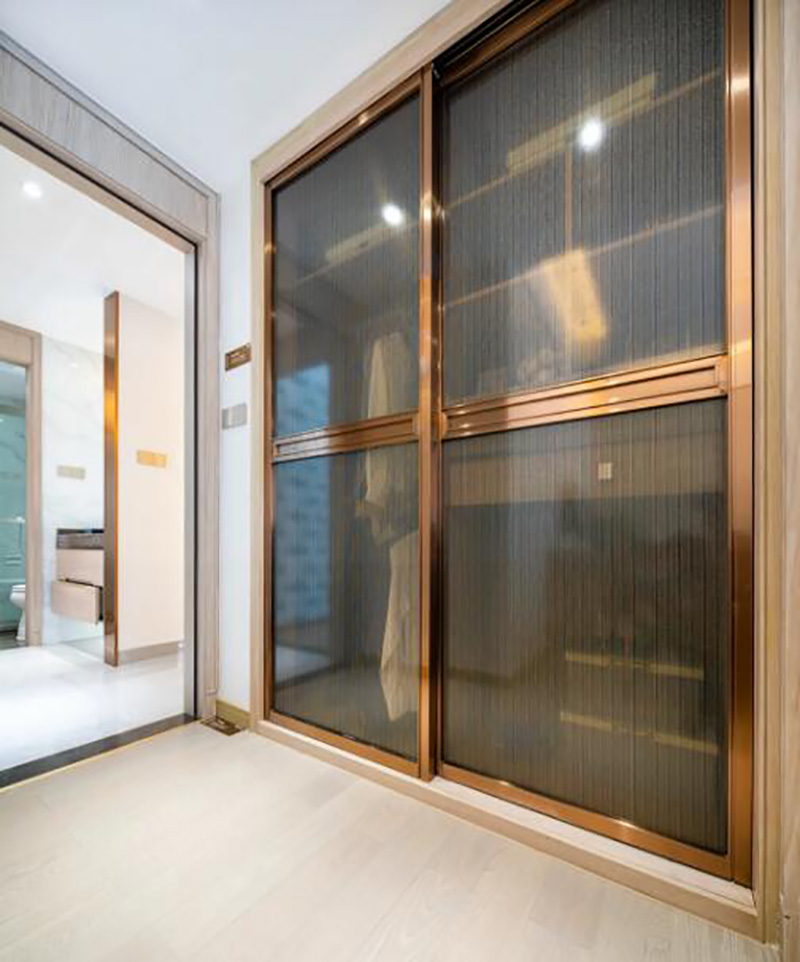 不銹鋼與夾絲玻璃的華麗組合,讓家更有層次感。主臥衣櫃是由玫瑰金不銹鋼與夾絲玻璃的多材質組合,不銹鋼推拉門讓衣櫃整體顯得穩重大氣,在裝飾燈的光影之下,夾絲玻璃若隱若現的變幻,反而給衣櫃增添一絲別樣風情。