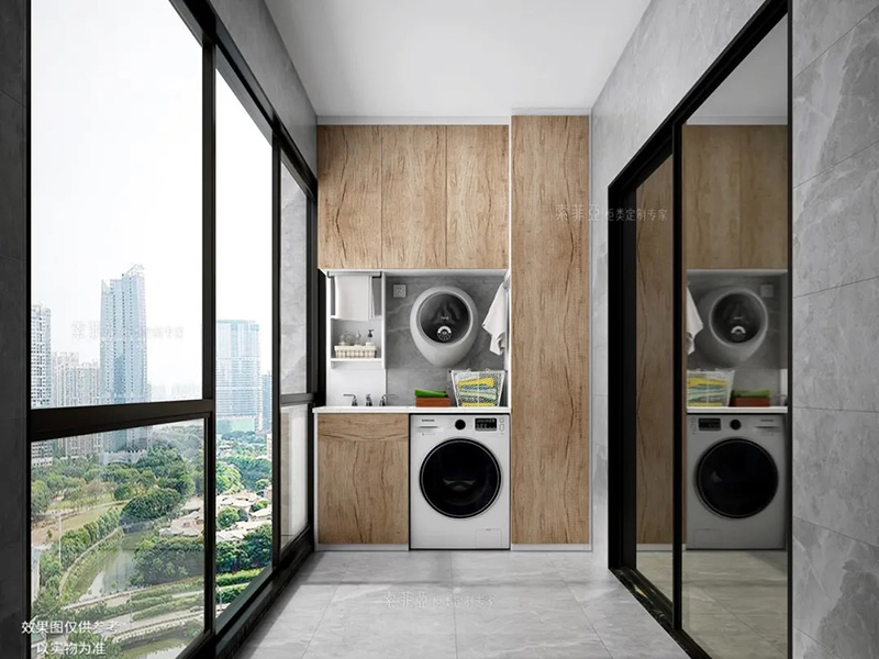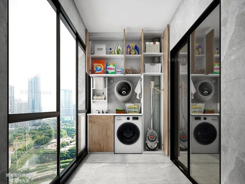無把手櫃子能造成一種“櫃子隱形”的視覺效果,看下面這個案例,陽臺后面的櫃子沒有打開時,是不是恍若無物?陽臺櫃采用無把手設計能最大限度提高櫃體的整潔度。