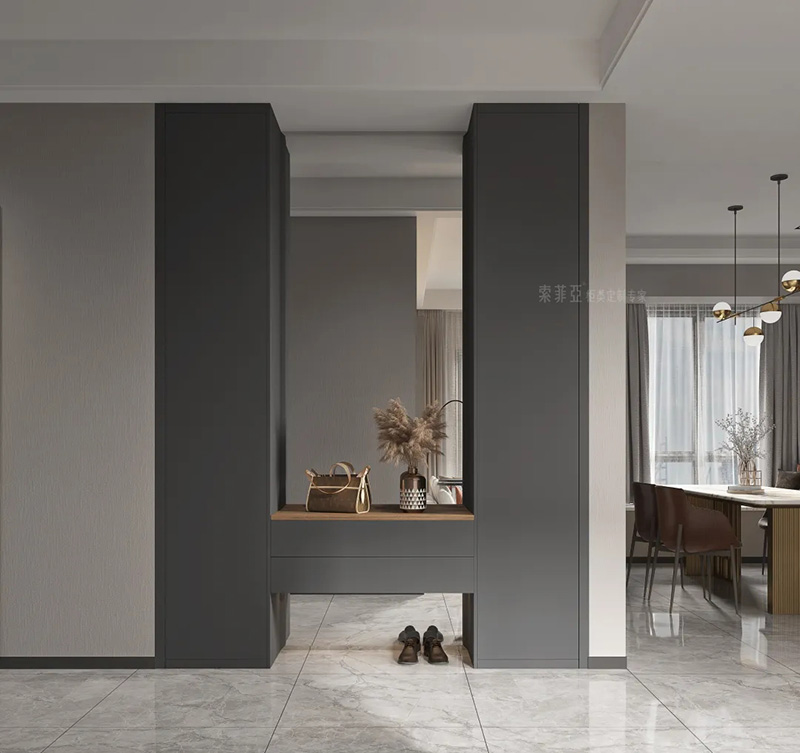 玄關空間一般不大,但要放的東西卻不少,像包包、衣服、快遞、鑰匙、鞋、雨傘等,難免瑣碎。如果玄關櫃采用無把手設計,就能有效弱化這種瑣碎感,也能進一步提升空間的整體性。