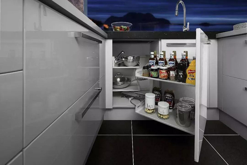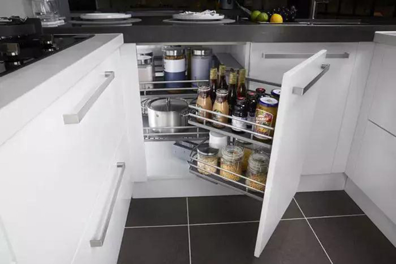 轉角拉籃必不可少。對于小戶型來說,空間真是寸土寸金,一點兒都不能浪費。轉角拉籃這個裝置非常巧妙,可以收納一些不常用的東西。