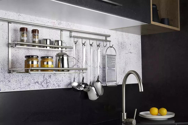 墻面的空間也必須充分利用起來,打造墻面掛鉤可以放平時常用的調味料,湯勺等~拿取超級方便。