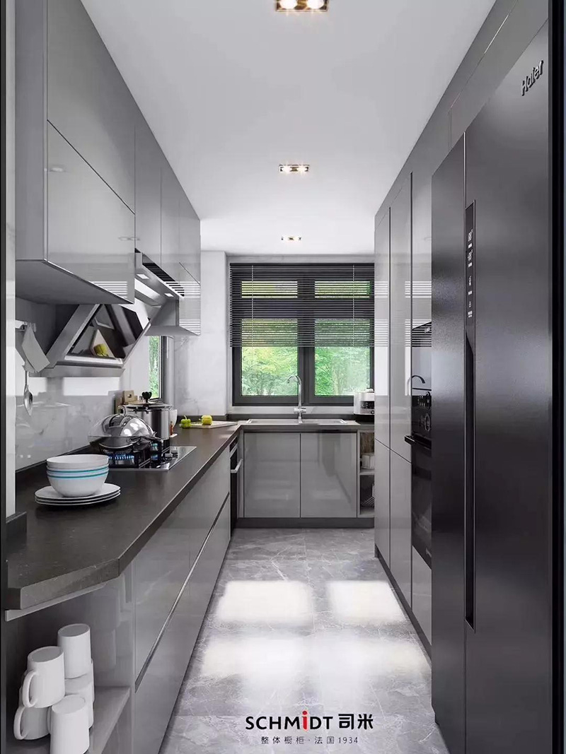 U型設計,在小空間里打造大功能區,緊湊但不擁擠,在寸土寸金的時代很實用。U型地櫃為廚房創造大量的收納空間,中立櫃可嵌入消毒櫃,烤箱等廚電,可輕松收納大件炊具。