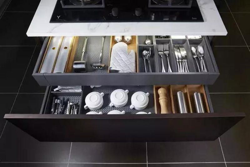 小廚房可以在櫥櫃內做垂直收納,最淺層放置湯勺,刀叉;最深處,放湯鍋等大件餐具。