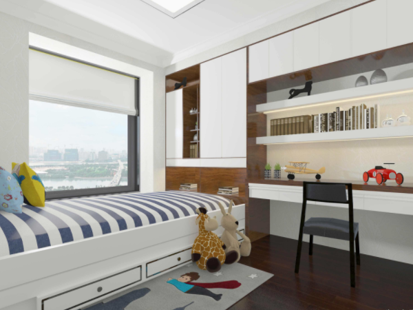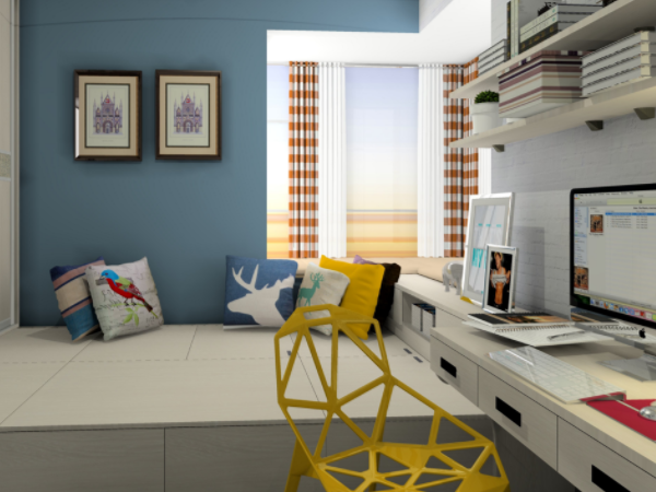 充分利用墻面空間,進行書櫃的打造,方便業主擺放書本以及裝飾品。還將書桌和書櫃相連,L形設計讓空間預留更多的活動空間。床鋪設計在窗邊,方便居住者倚靠,觀賞窗外美景。通過色彩的強烈的對比,讓空間裝飾更加立體,充滿個性化活力。