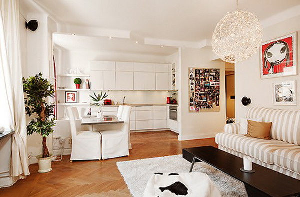 以節省空間,家具布置盡量使就餐上菜快速簡便,將二者進行合並整合可以達到這種效果。要充分利用空間,家具的擺設選擇必須較為實用,另外就餐環境不能受廚房烹飪的干擾,影響進餐心情,所以盡量有自然隔斷,餐桌的布置遠離廚具,可以使用照明燈具來進行隱形分割,利用燈光的不同,分割出就餐區與烹飪區。