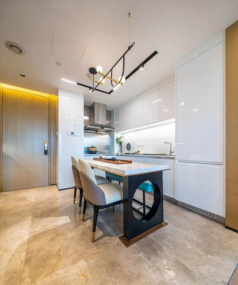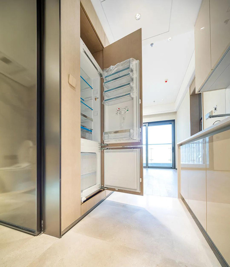 內嵌式冰箱櫃,將冰箱完美隱藏到櫃子里,不僅美觀好看還節省空間。隱藏拉手設計既方便開門,也不會顯得突兀。內嵌式冰箱最重要的是要做好上下循環風散熱設計,設計師在設計時將冰箱櫃櫃體的寬度和深度都做了合理的空間預留,確保循環散熱的同時充分利用每一寸空間。