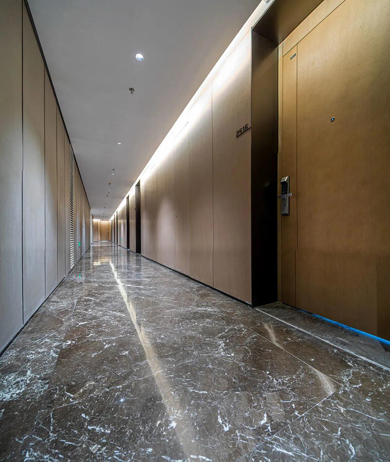 精心裝點歸家動線。樓道走廊裝潢統一采用橡木木飾面,配合內嵌式回廊頂部燈光,告別白墻的單調冷清,給業主營造歸家的溫馨感。