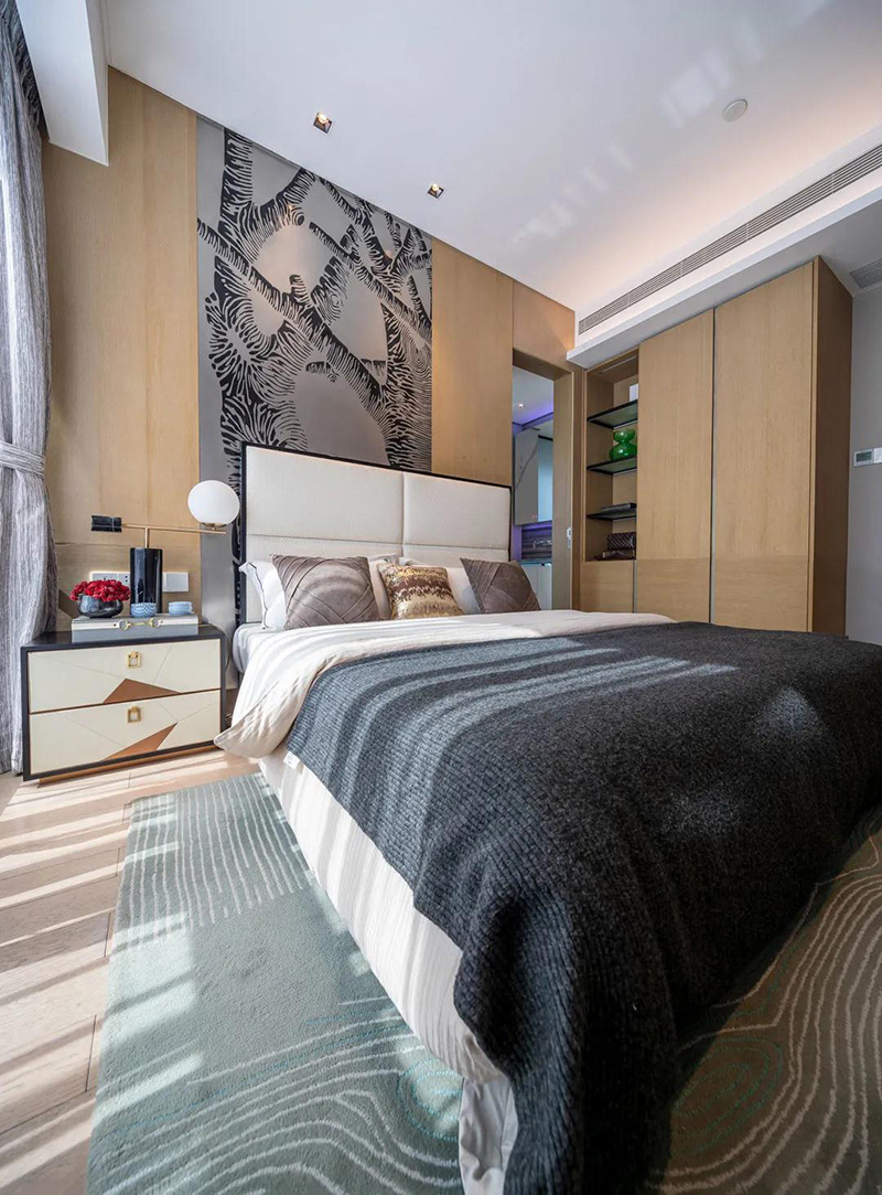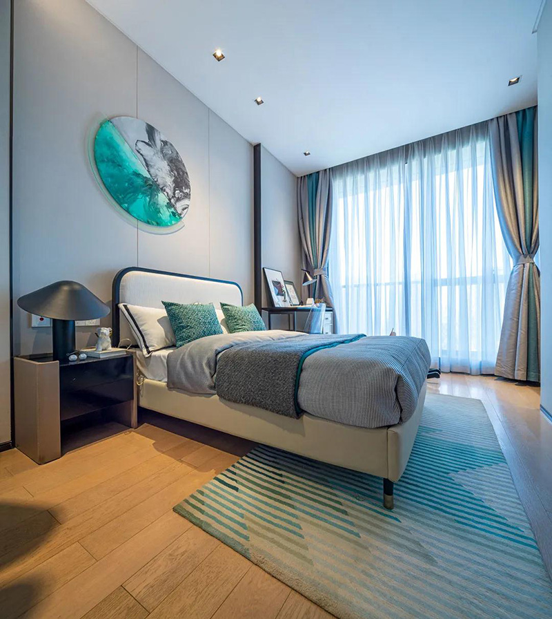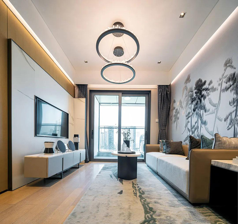 低飽和度色彩是奠定恬靜空間基調。深業中城項目大面積選用低飽和度色彩,灰、白、黑、橡木色的結合,打造靜謐有序空間,舒緩城市勞碌繁忙的生活節奏,讓人更好地在家中尋獲休憩與撫慰。