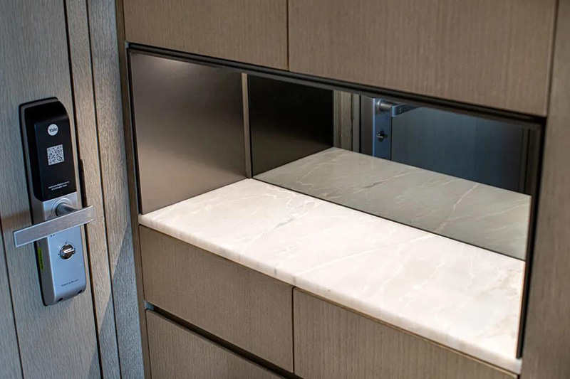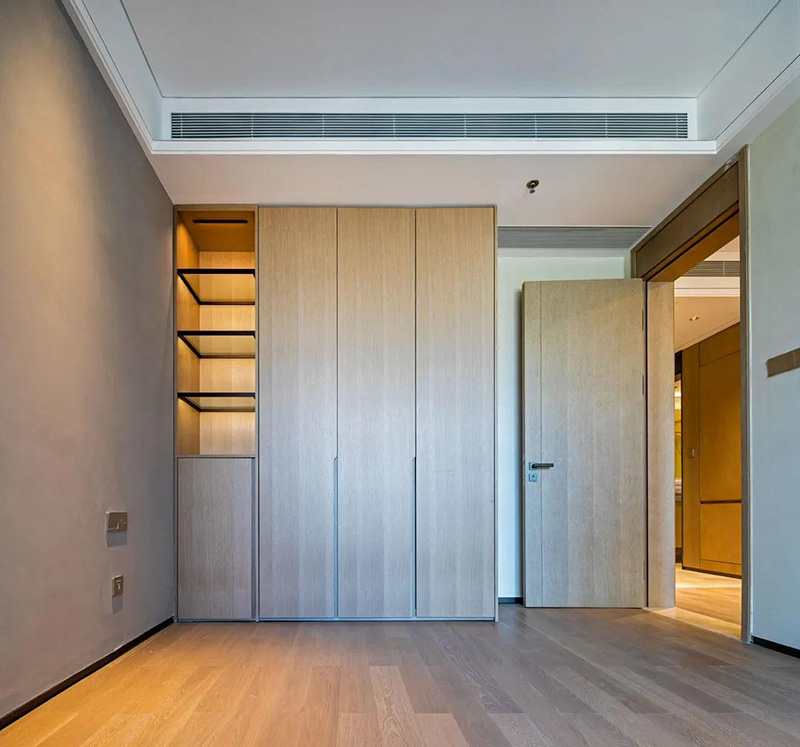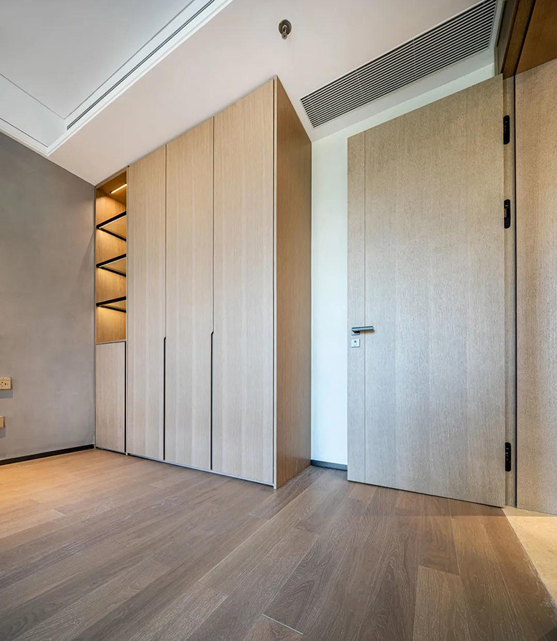 木門采用天然直紋白橡木貼皮,讓全屋的設計形成視覺上的和諧統一。木門內部采用橋洞力學板作為門芯,堅固耐沖擊,擁有保溫隔熱、高效隔音等優點,提升終端客戶居家時的舒適感。
