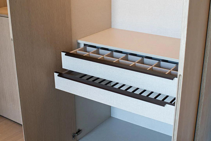 ·多樣功能:衣櫃配置格子抽與高端抽拉褲架,集收納展示功能于一體。