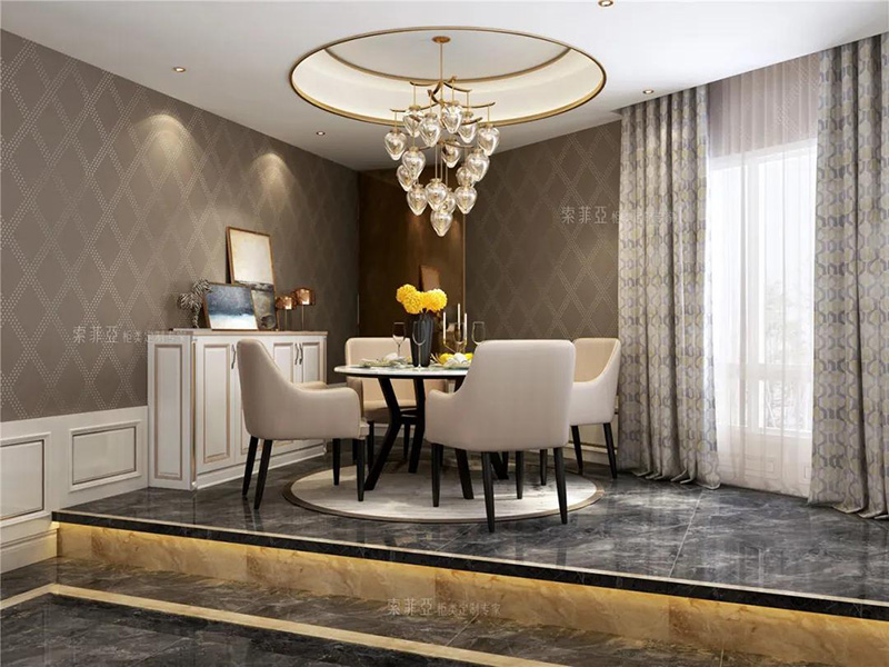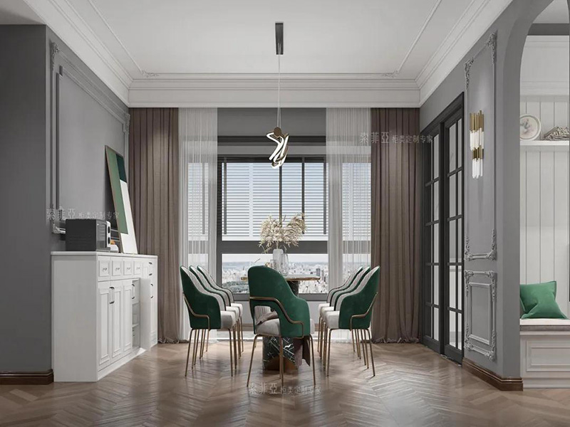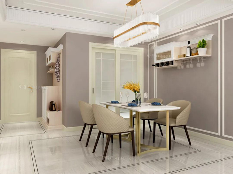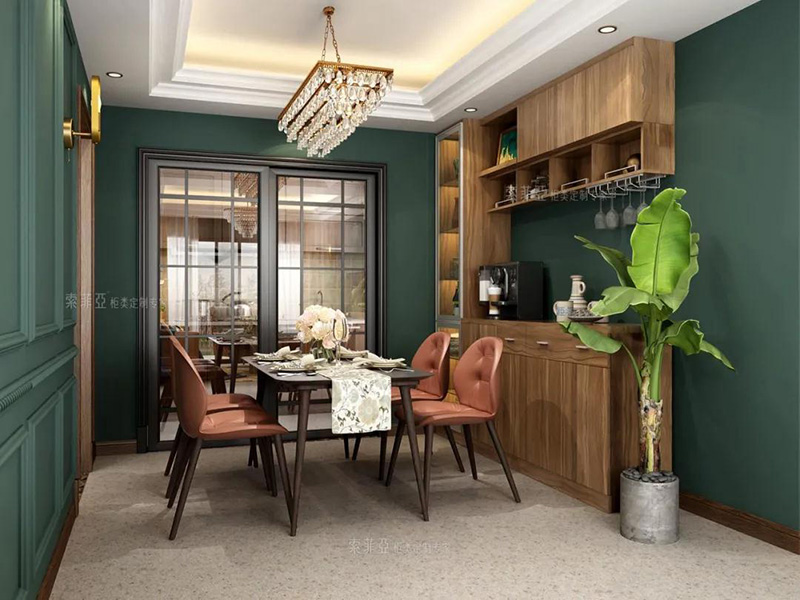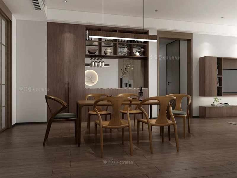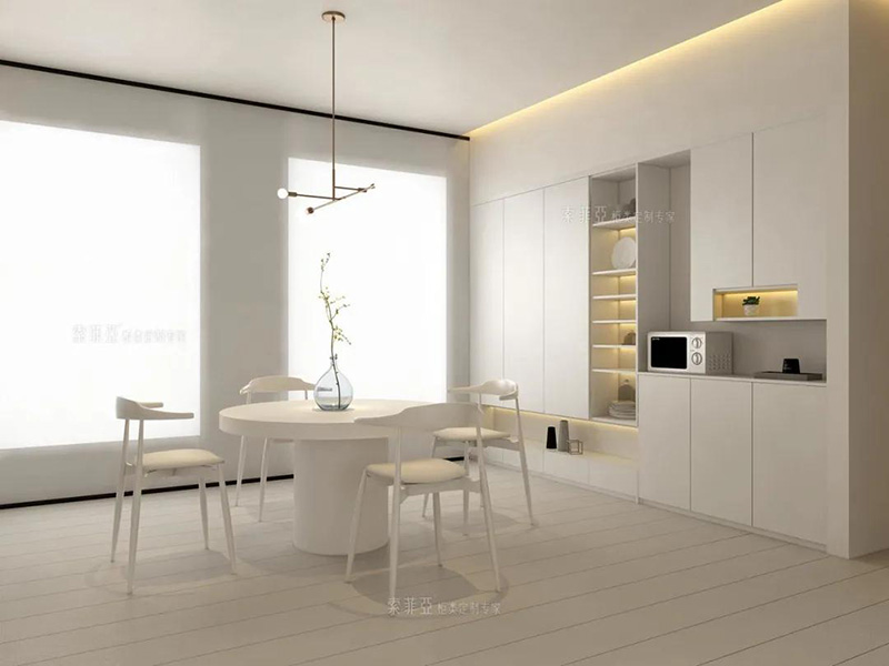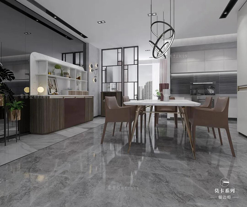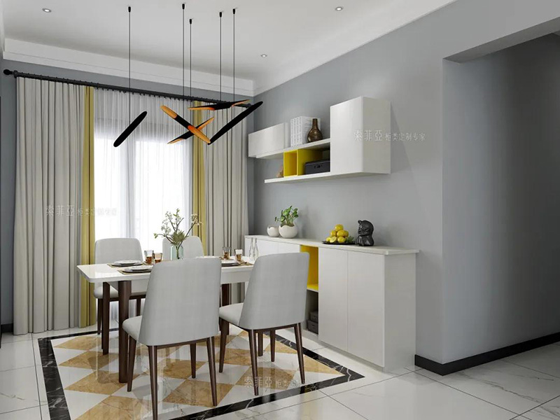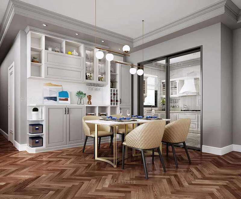 除了矮櫃餐邊櫃之外,還可以做吊櫃餐邊櫃,好處是足夠高,孩子不會碰撞到餐邊櫃上的物品,且可以留出通道,方便家庭成員從餐廳走到廚房。