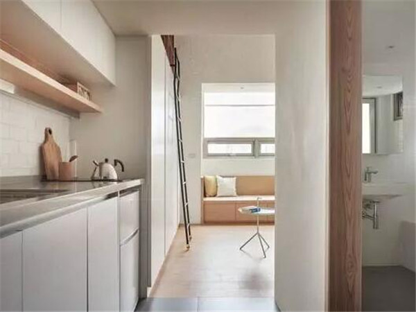 與以往介紹戶型不同的是,分析要從玄關入手 ,大部分小公寓入門口的位置都是小型的廚房和衛生間的入口,儲物功能是一定要有的,所以地櫃吊櫃一應俱全。