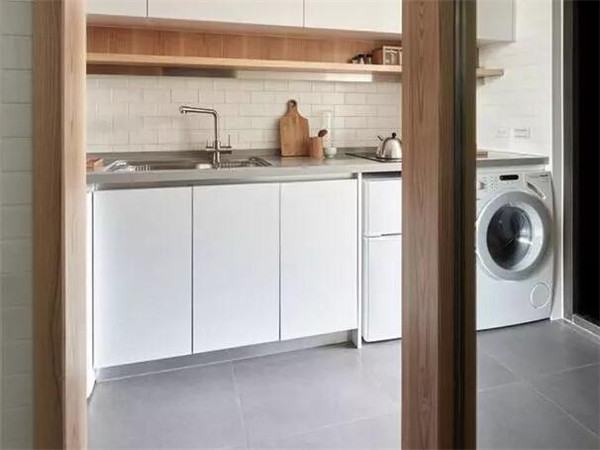 為了讓空間更為狹小的走道處不至于過于壓抑,設計師采用了深色仿古磚地面和白色櫃體的搭配,增加空間的亮度。如果是沒有陽臺的公寓,洗衣機得買洗烘一體機了。