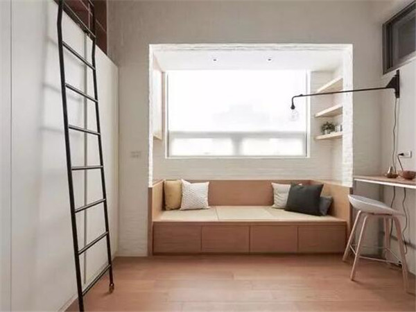 摒棄留出的生活陽臺,將其打造成了綜合活動區域的沙發休閑區,利用兩邊的墻體和沙發底部的空間制作了許多儲物櫃。儲物功能升級就靠這些細節設計了。