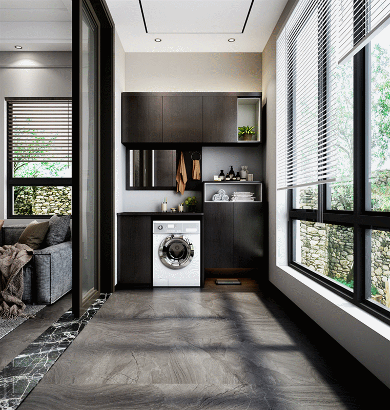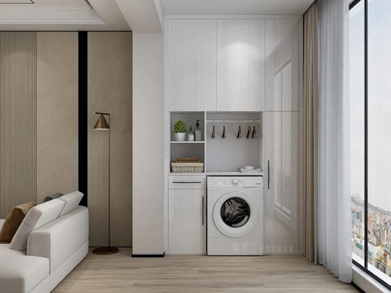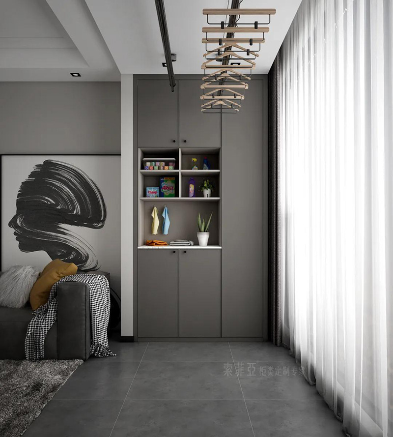 要是家里有專門放洗衣機的地方,陽臺也可以打造成收納小家電清潔用品的家務區。