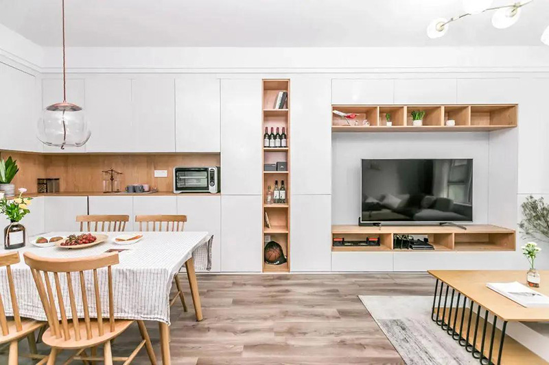 下面這兩個整墻電視櫃讓人驚喜,電視櫃跟入戶櫃和餐邊櫃結合,簡直是小戶型的設計典范。