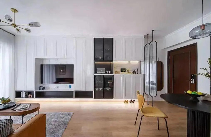無論是白色還是黑色,整墻式電視櫃只要跟硬裝搭配和諧,都能讓得空間顯得更寬敞舒適。