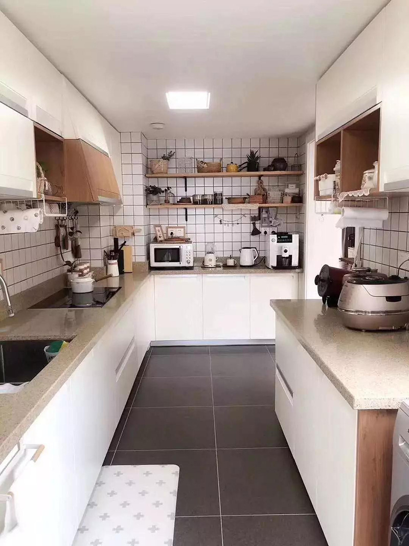 空間小或者沒有窗的情況下,選擇白色櫥櫃+亮面門板或白色櫥櫃+開放式收納,反射的光線能讓廚房愈加寬敞明亮。開放式收納更能節省廚房空間。
