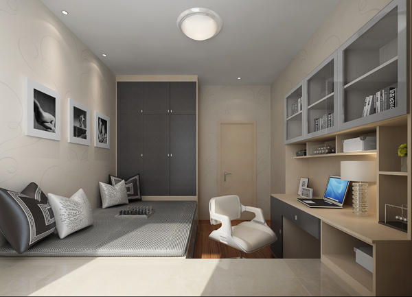 灰色的書房自帶著沉穩大氣,不要覺得書房只要擺個書桌和書櫃就可以了嘛——榻榻米這種裝備也必不可少!熬夜工作學習時,可以就近入睡,不會打攪到家人。有朋友來時也可以充當客房。