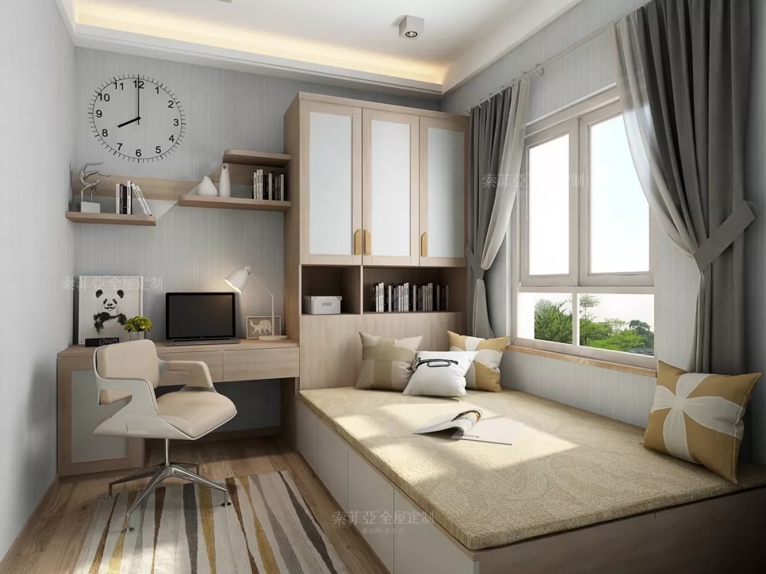 整面的儲物櫃,逼仄的空間也能實現輕松收納。書房+臥室的布局,將有限的室內空間充分利用起來,讓生活更加隨心所欲。