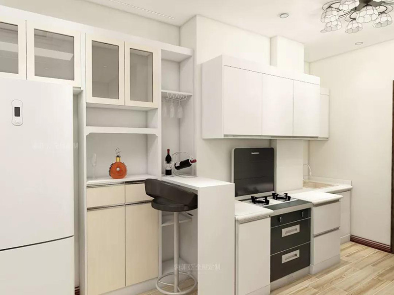 極簡風的廚房,順暢的洗切炒流線,讓你的廚藝發揮更加得心應手。緊靠廚房的吧臺酒櫃,在閑暇時間,炒上兩碟小菜,加一壺濁酒,足以慰平生。