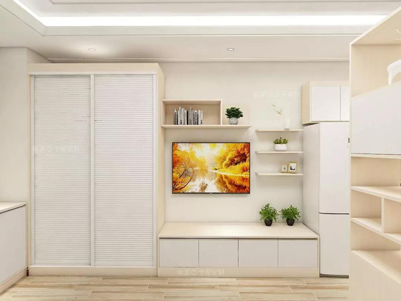 為了更好地利用空間,實現了臥室和客廳二合一的設計。電視櫃和衣櫃組成的緊湊線條,讓視線集中而不覺繁亂。壁掛電視搭配簡單的層板用作收納,讓壁面線條更加簡約。
