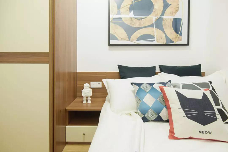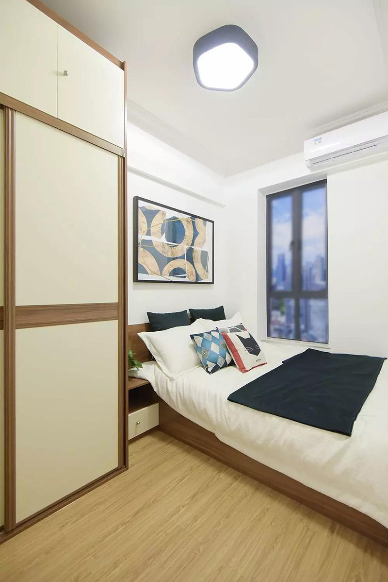 床頭櫃緊貼衣櫃和床,不留縫隙。房子小,但每一寸空間都用到了極致,毫不浪費。