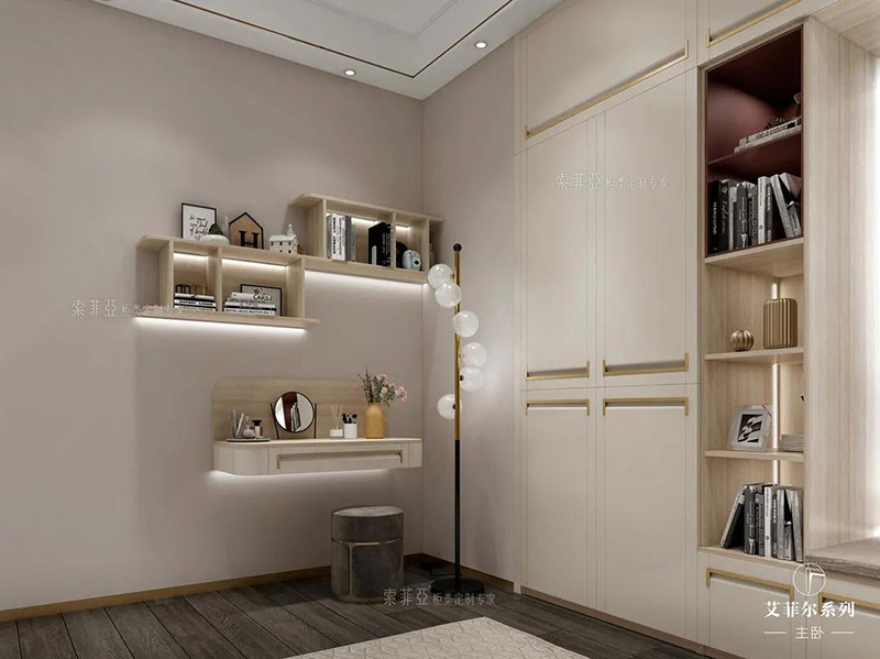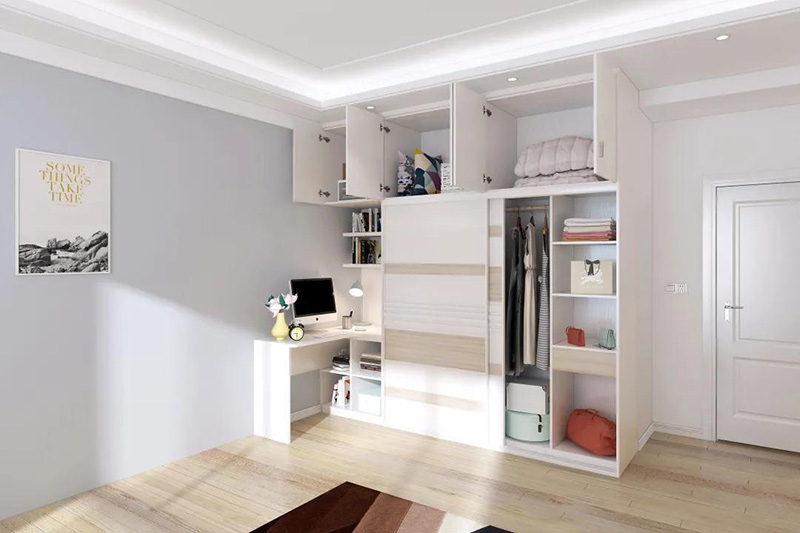 衣櫃還能和梳妝臺、書桌結合,從衣櫃中間拉出個桌子來,小臥室也能輕松擁有辦公區和梳妝區。