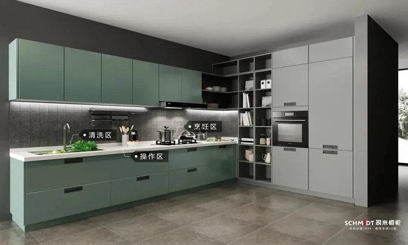 ▲U型櫥櫃的洗切炒三大區域可以形成三角動線,做起飯來超快!適用于廚房是長方形,開門方向在長邊,也沒有陽臺門打斷臺面的戶型