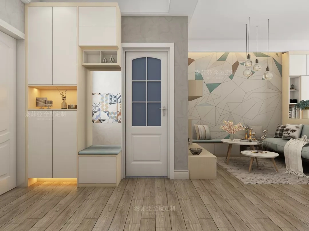 北美楓木的溫暖,羽白栓木的純凈,搭配上換鞋凳櫃的慵懶,簡單的入戶設計也有不一樣的溫馨舒適。