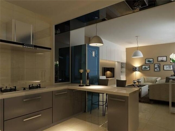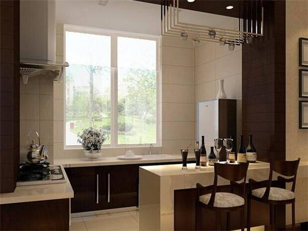 4、如果把廚房做成局部開放,只有一個窗臺大小的位置和餐廳相通的話,這樣防油煙的效果會比較好,炒菜時可以用玻璃、簾子或者其他東西遮擋一下,等做飯完畢油煙排干凈再把擋板拿開,也是一種方法。