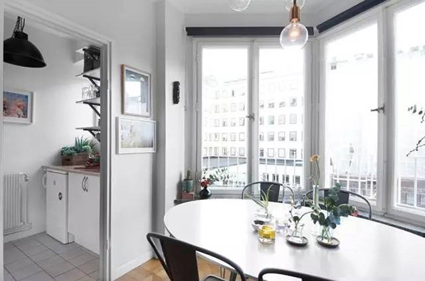 有限的廚房空間更容易顯得幽閉,選擇純白色的櫥櫃,墻面吊櫃也改成開放式置物架,讓小廚房也顯得寬敞有風格。