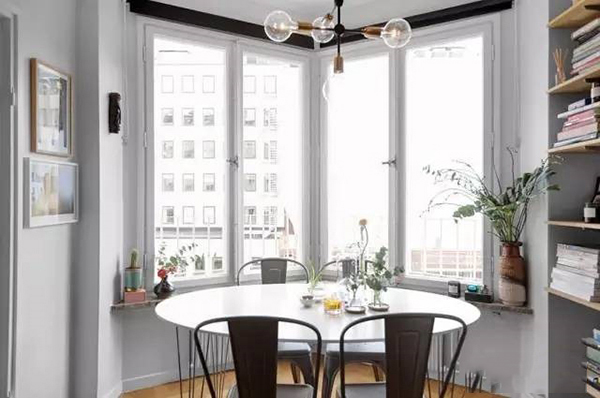 靠窗的餐桌刻意選擇了圓潤、柔軟的圓形餐桌,有別于一般的方形餐桌,讓空間少了壓迫感。